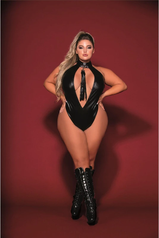 Body Fetish Grande Taille Simili Cuir Extensible Col Clouté et Fouet