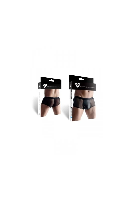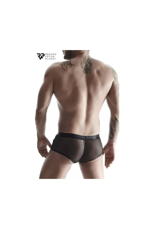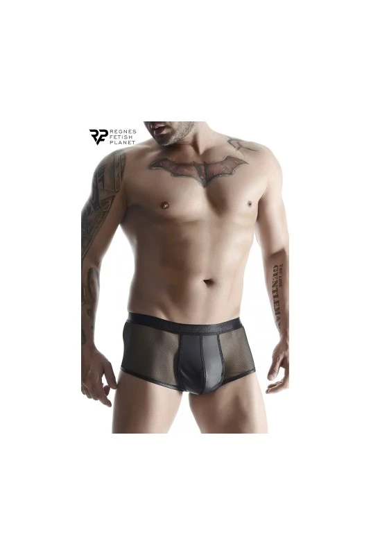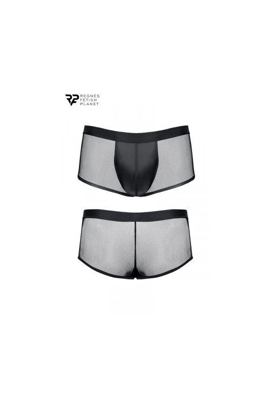Boxer noir en résille et wetlook brillant pour homme de chez Regnes Fetish Planet, parfait pour un look sexy.