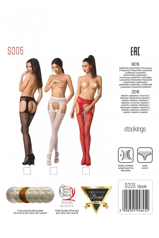 Collants ouverts en résille noire soulignée d’un motif fantaisie et quatre fausses jarretelles.
