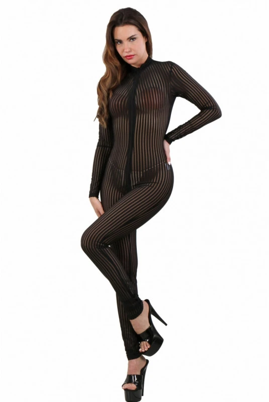 Combinaison Micro Résille Transparente Rayée à Zip Noire