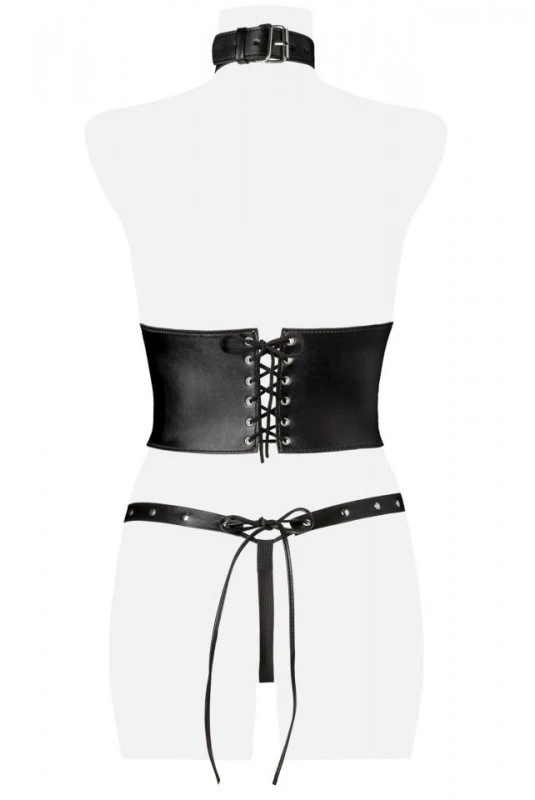 4 pièces : 1 corset avec collier de soumission, 1 paire de cache-tétons, 1 paire de manchettes, 1 string.