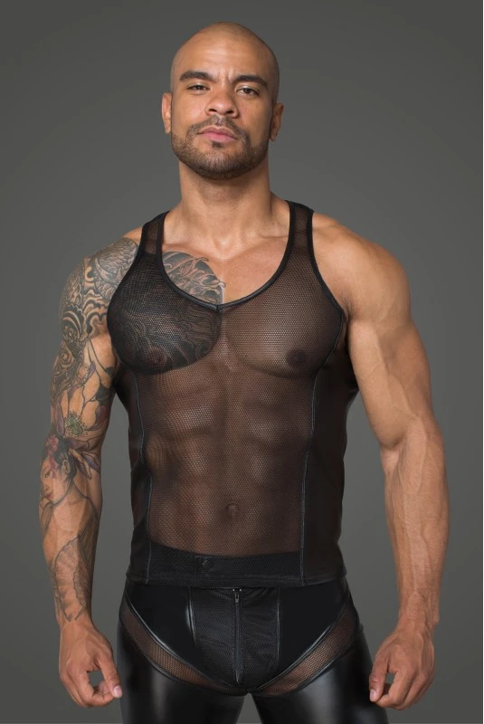 Le débardeur filet devient un marcel sophistiqué grâce à l’ajout de pièces wetlook sur les cotés.