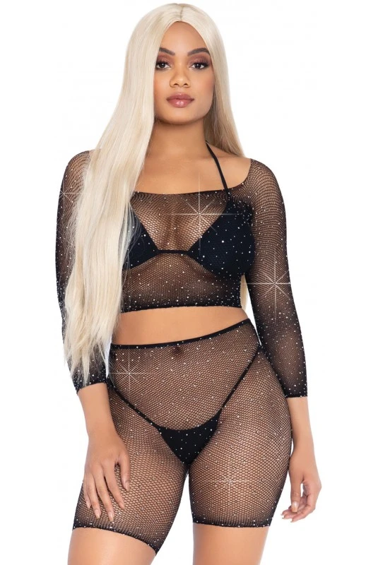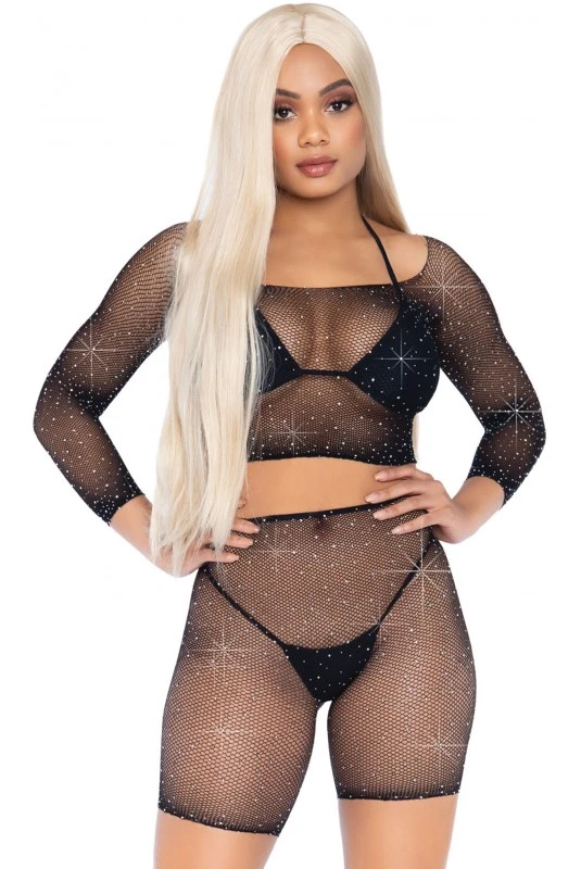 Ensemble Résille Strass Cycliste et Top Manches Longues Noir