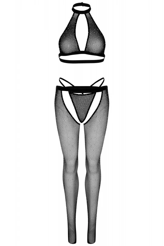 Ensemble Résille Strass Top String Collants Ouverts