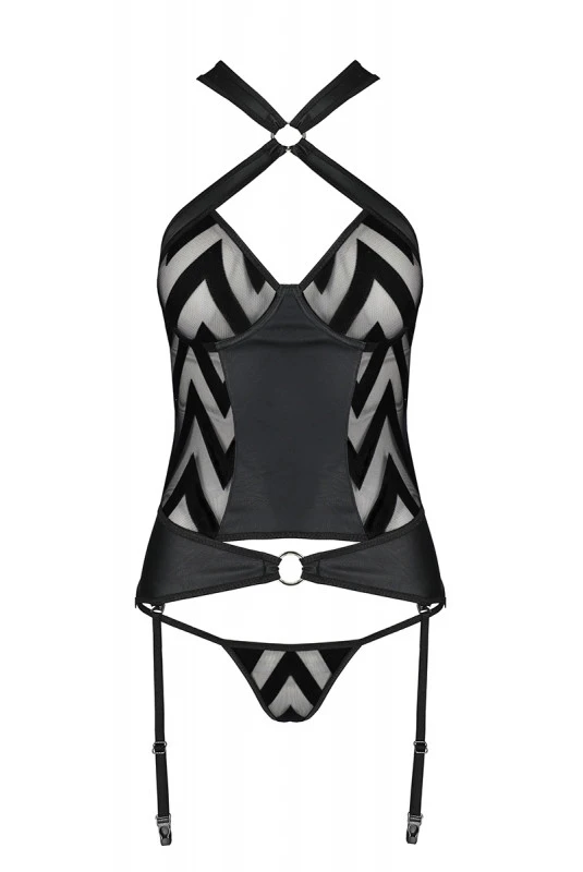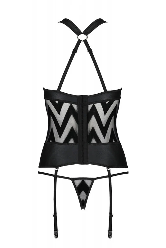 Ensemble guêpière et string Hima en tulle décoré de chevrons et faux cuir, par Passion Lingerie.
