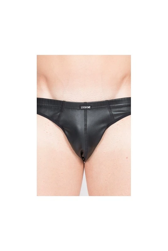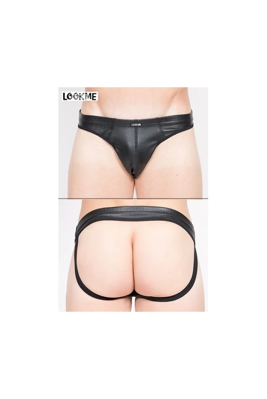 Jock strap aspect faux cuir, très sexy avec ses larges élastiques qui soulignent les fesses.