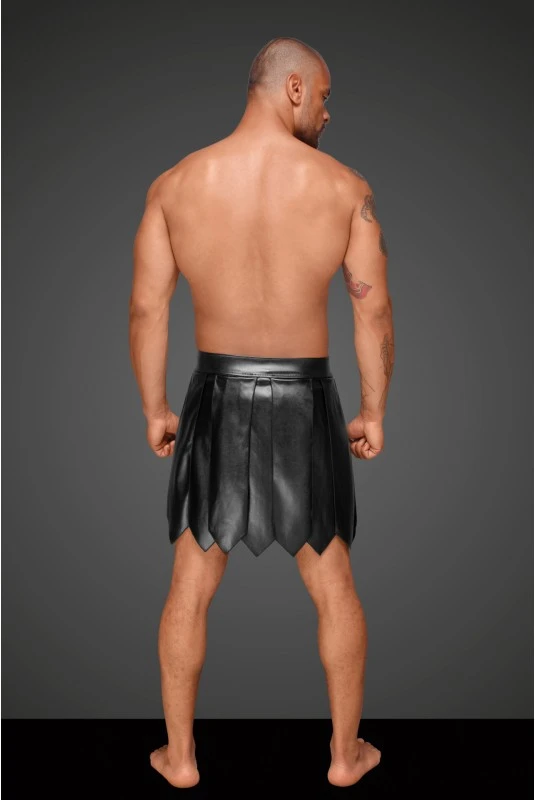 Jupe homme simili cuir, décoré devant d’une bande vinyle plissée retenue par quatre pressions.
