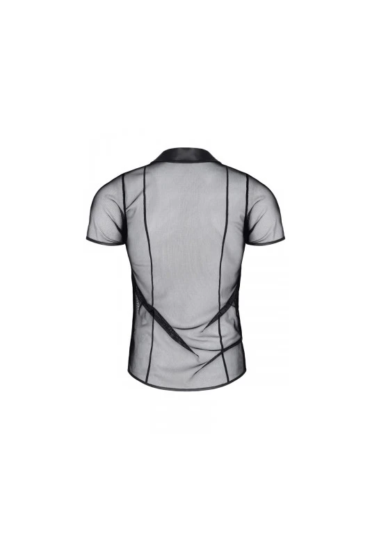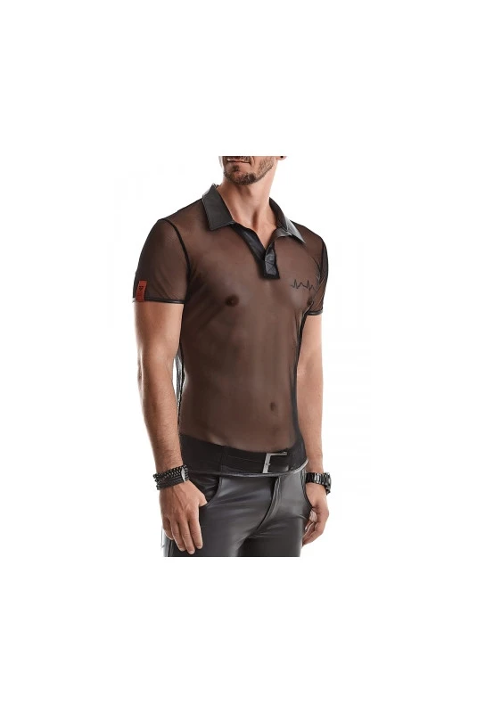Polo noir fabriqué en tulle transparent et tissu effet wetlook, imaginé par la marque Européenne Regnes Fetish Lingerie.