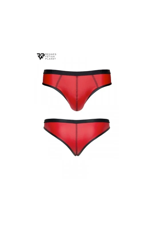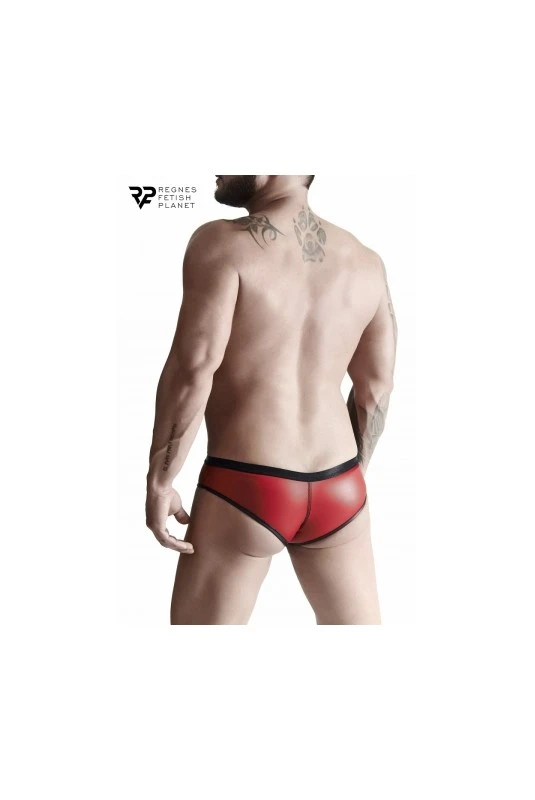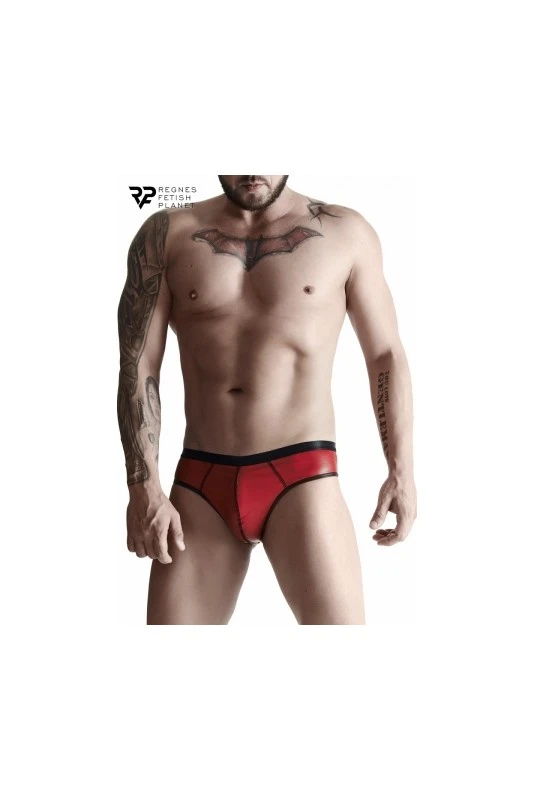 Slip sexy en tissu wetlook brillant rouge aux coutures renforcées fabriqué par la marque Européenne Regnes Fetish.