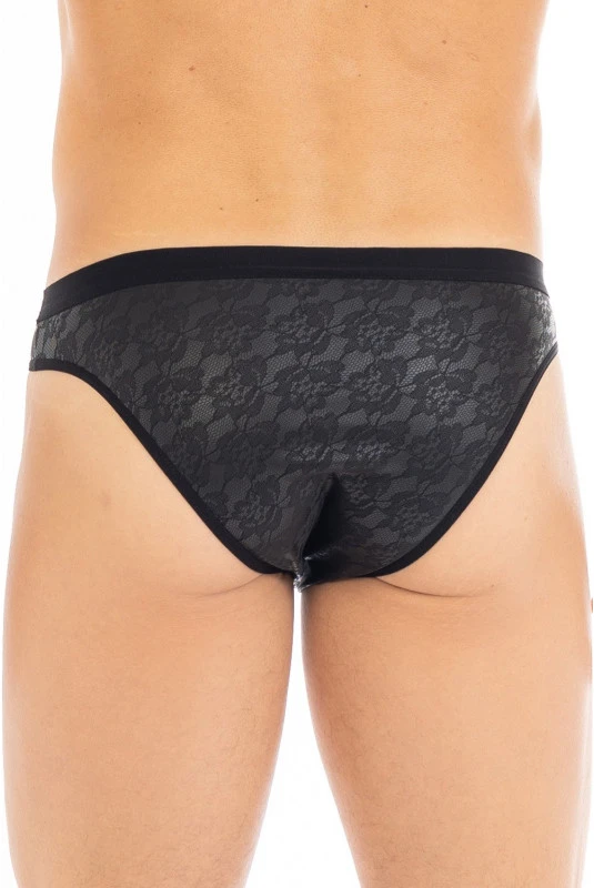 Slip sexy noir avec impression dentelle, en simili cuir, lingerie pour homme.