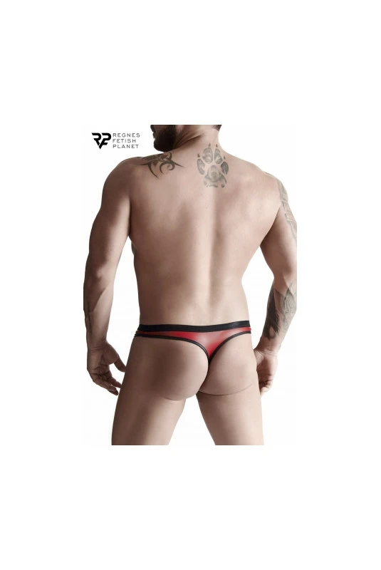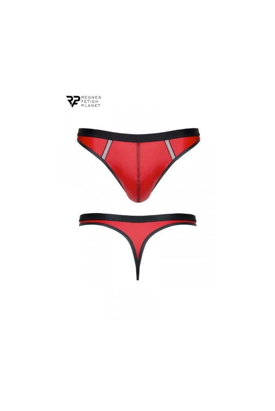 String rouge en tissu wetlook avec deux bandes de résille. Fabriqué en Europe par Regnes Fetish Planet.