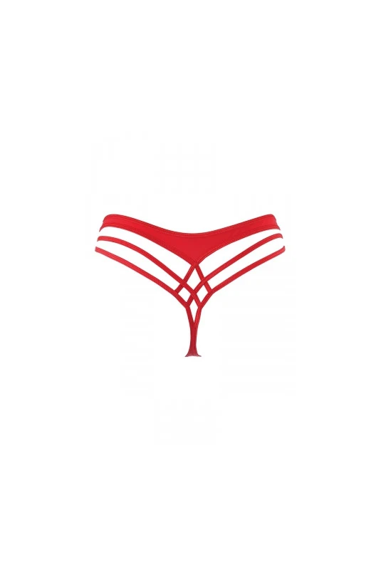 String sexy fantaisie en jersey rouge, décoré de perles dorées devant, et décolleté sur les fesses.