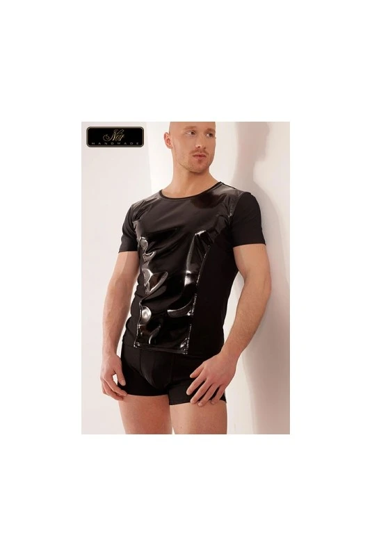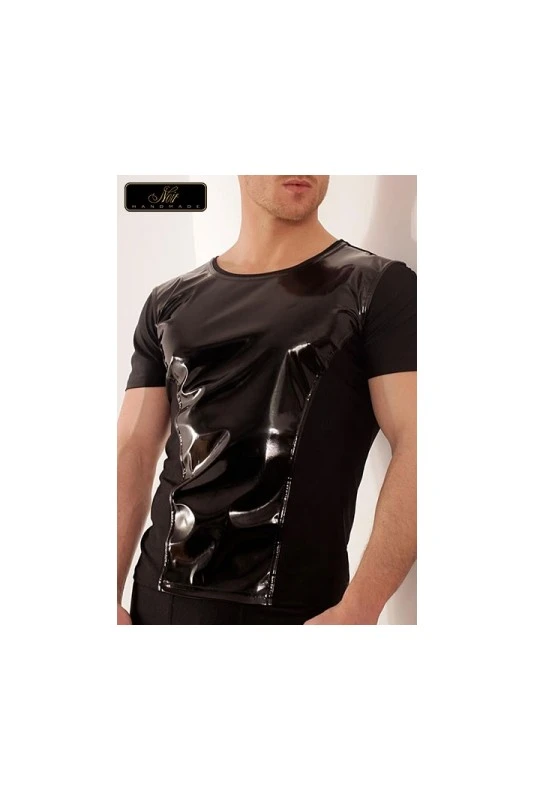 Tee shirt moulant moulant en lycra au plastron de vinyle brillant.