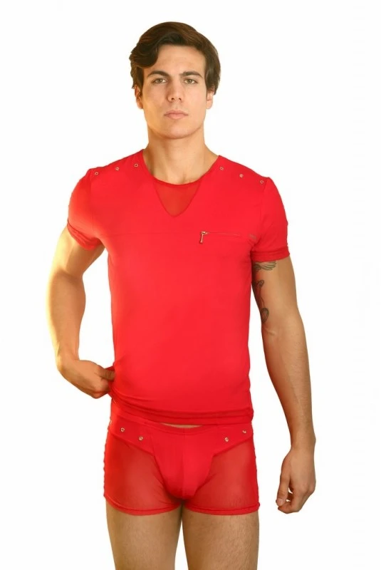 Tee-shirt moulant structuré avec des empiècements de fine résille, poche sur la poitrine et les rivets décoratifs sur les épaules.