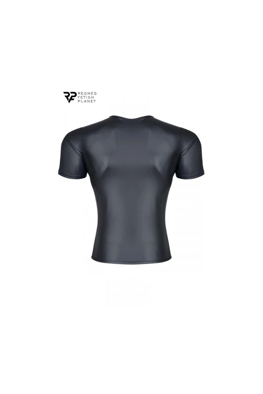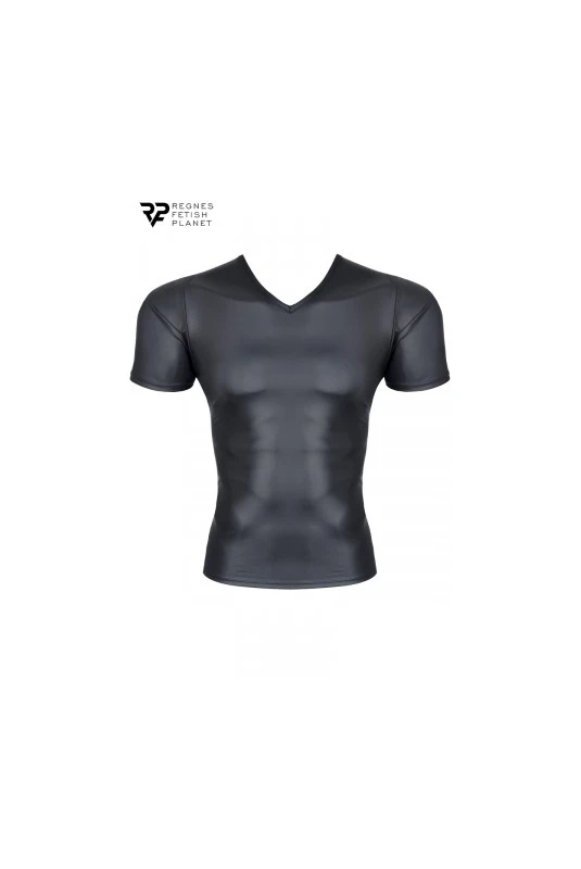 T-shirt homme wetlook noir classique, sexy et moulant avec col en V. Fabriqué en Europe par Regnes.