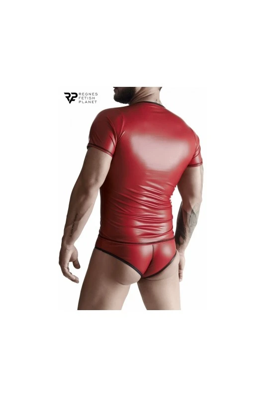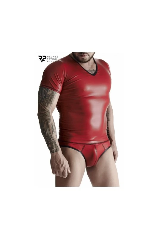 T-shirt homme wetlook rouge classique, sexy et moulant avec col en V.