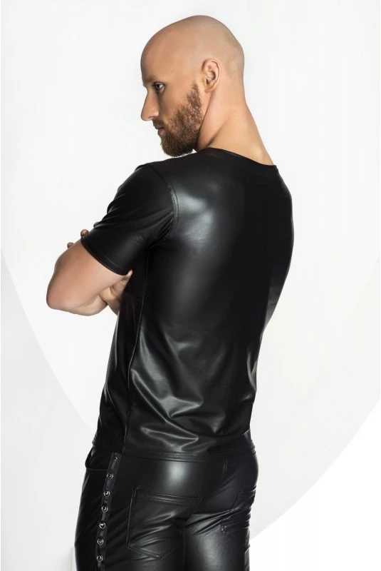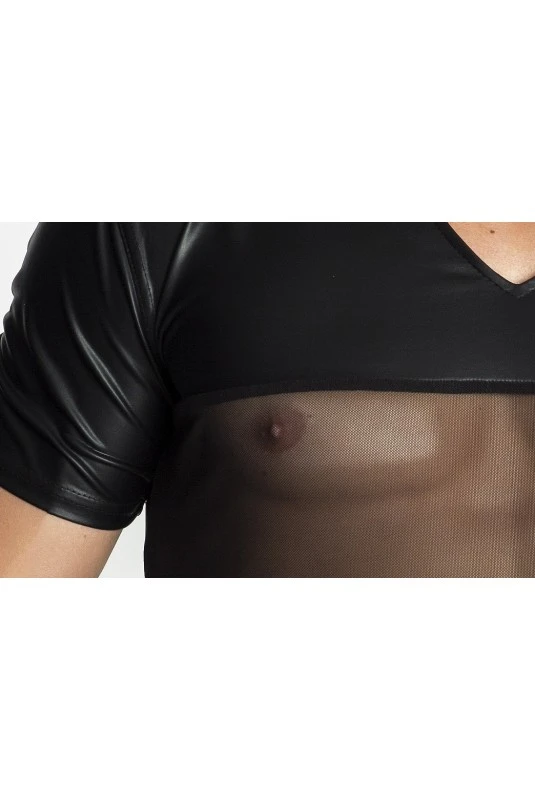 T-Shirt Noir Fetish V sexy en wetlook mat barré d’une large bande de tulle transparent sur la poitrine..