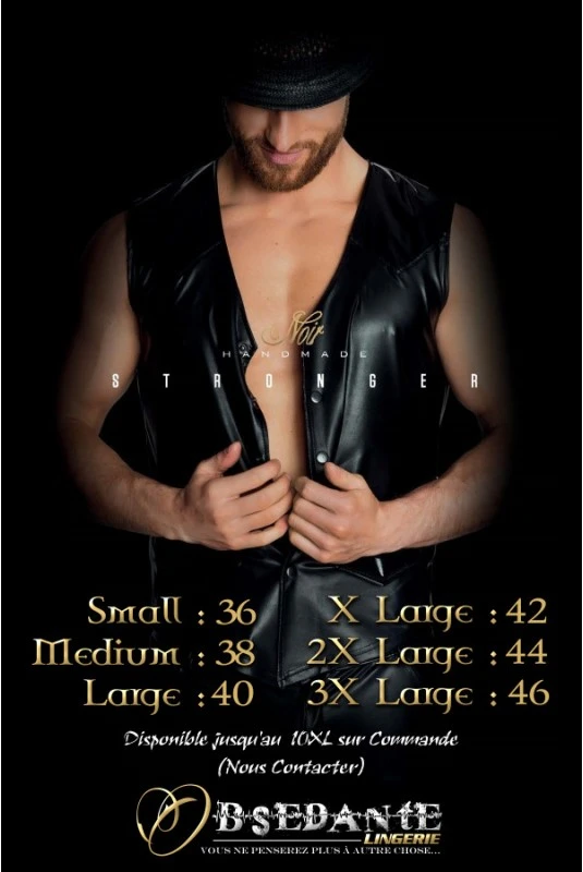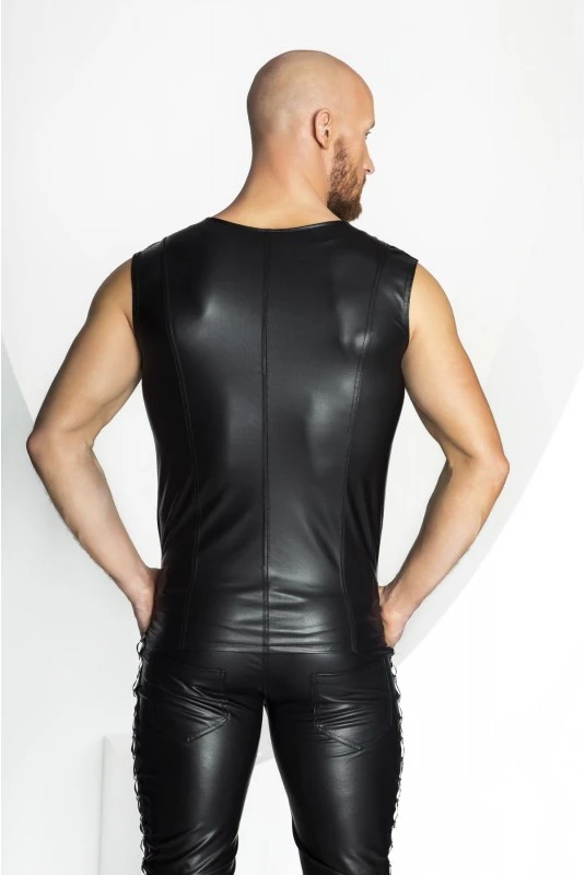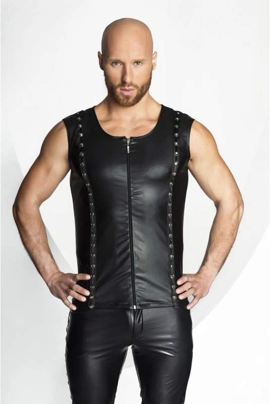 Veste fetish homme sans manches en wetlook mat fermée par un zip ornée de rivets et d’anneaux métal style piercing.